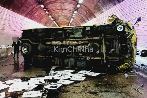 Xe buýt chở học sinh tiểu học lật tại hầm Maseong, 6 người bị thương