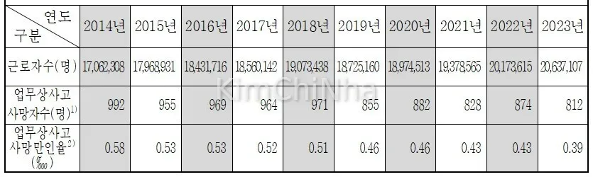 Theo Bộ Lao động và Việc làm Hàn Quốc, số người tử vong trong lao động năm 2022 là 874 người, năm 2023 là 812 người, năm 2024 là 827 người, tương đương trung bình 2,3 người tử vong mỗi ngày trong 3 năm gần đây. Năm ngoái, ngành có số người tử vong cao nhất là xây dựng (328 người, 39,6%), sản xuất (187 người, 22,6%) và vận tải – kho bãi – viễn thông (138 người, 16,6%).