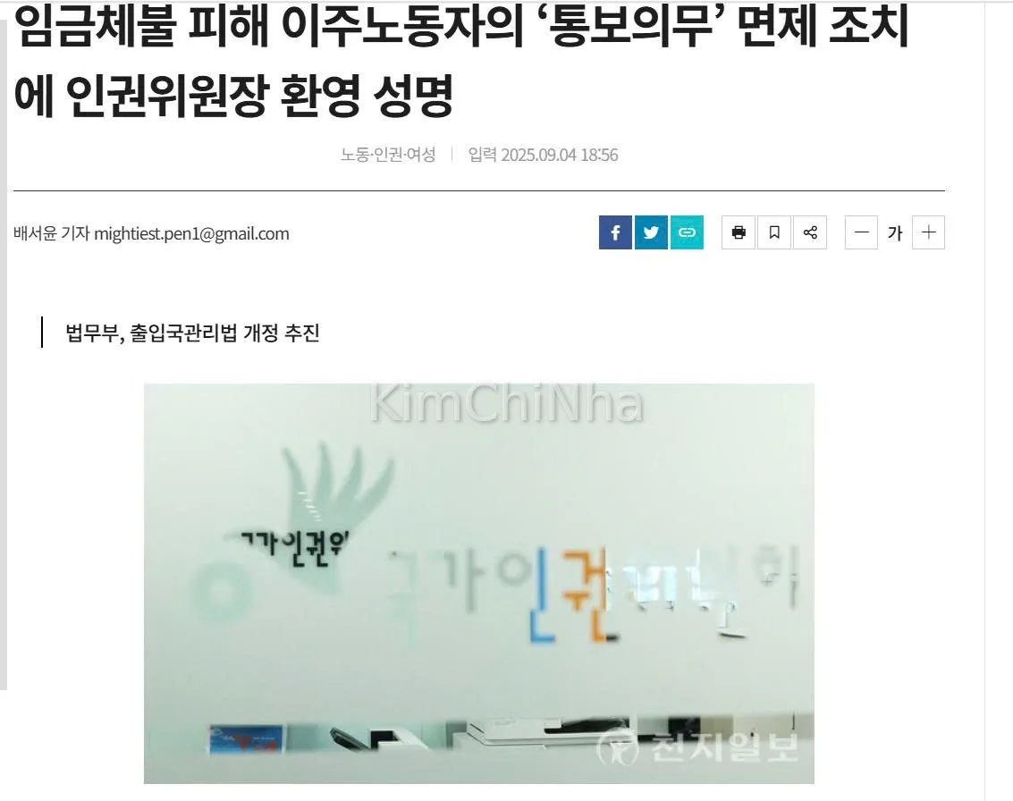 Tháng 5/2024, Ủy ban Xóa bỏ Phân biệt Chủng tộc Liên Hợp Quốc (CERD) đã bày tỏ lo ngại trước tình trạng trên, đồng thời khuyến nghị Hàn Quốc cần mở rộng phạm vi miễn trừ nghĩa vụ thông báo, để lao động nhập cư – đặc biệt là người cư trú bất hợp pháp – có thể yên tâm tố cáo các vi phạm về quyền lao động.