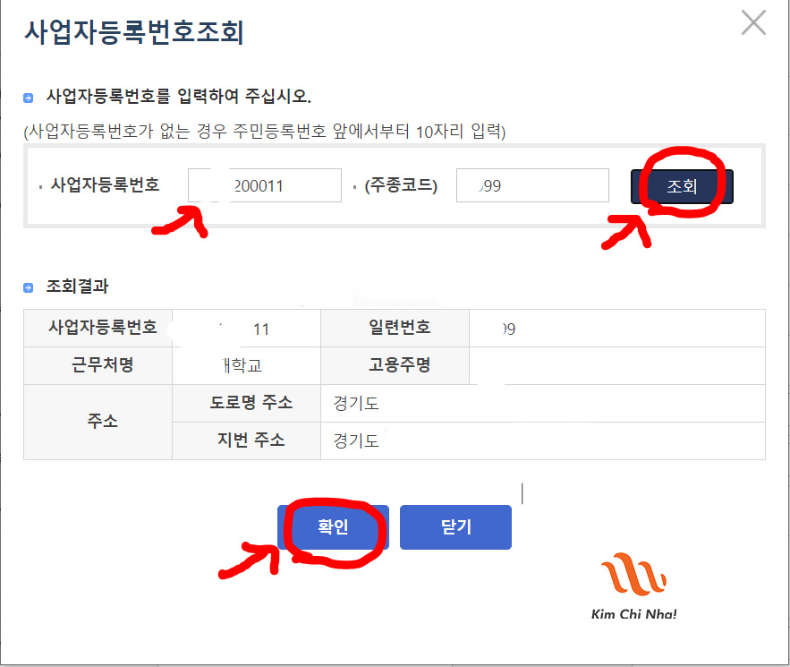 Bước 7: Nhấn 조회 ở mục 1 để điền mã đăng ký kinh doanh nơi bạn làm việc