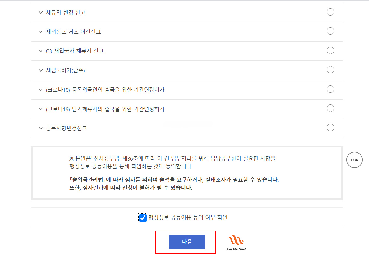 Bước 5: Kéo xuống dưới tích chọn 행정정보공동이용동의 rồi nhấn 다음