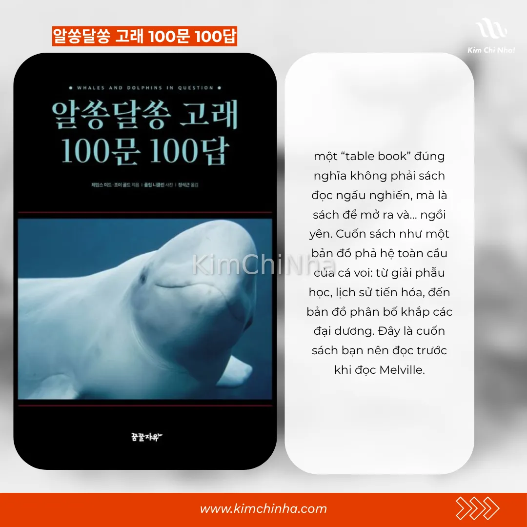 📘 고래: 고래와 돌고래에 관한 모든 것 là một “table book” đúng nghĩa không phải sách đọc ngấu nghiến, mà là sách để mở ra và… ngồi yên. Cuốn sách như một bản đồ phả hệ toàn cầu của cá voi: từ giải phẫu học, lịch sử tiến hóa, đến bản đồ phân bố khắp các đại dương. Đây là cuốn sách bạn nên đọc trước khi đọc Melville. Còn nếu bạn cần một người dẫn đường đặt câu hỏi trước khi đưa thông tin, thì 알쏭달쏭 고래 100문 100답 là thứ bạn cần.