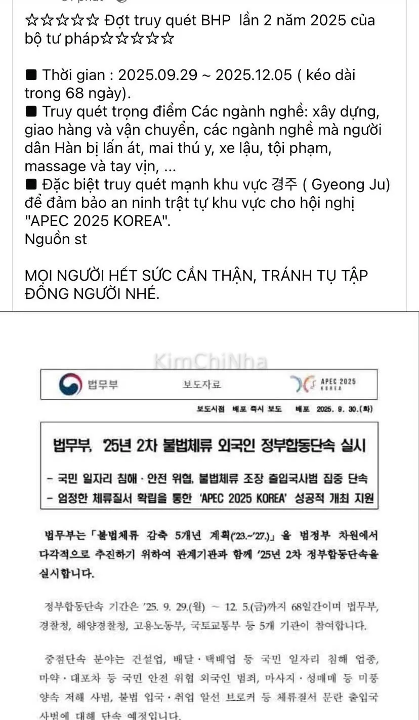 Nhìn những dòng cảnh báo “tránh đi nhé”, tôi lại nhớ đến một sự thật buồn cười: người Việt ở Hàn, nhiều khi đoàn kết nhất không phải khi hội họp văn hóa, không phải khi kêu gọi làm điều tốt, mà chính là lúc báo nhau né truy quét. Cái “nghĩa đồng bào” lộ ra trong tin nhắn vội vã: “Anh chị đi làm thì cẩn thận, chỗ này hôm nay có cảnh sát.” Nó vừa đáng thương, vừa đáng buồn.