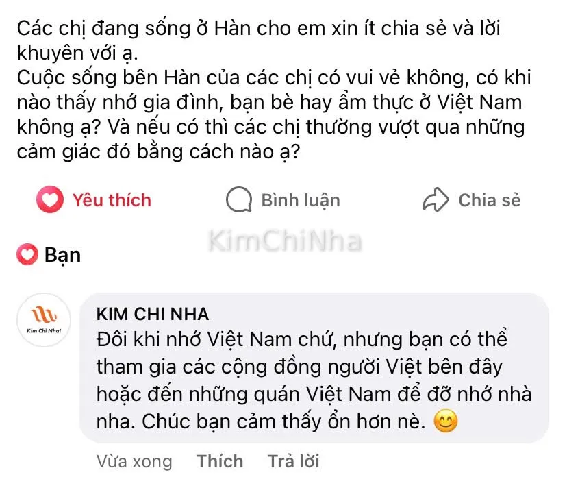 Mình tin rằng bất kỳ ai từng ở Hàn, dù là du học sinh, lao động hay định cư, đều ít nhất một lần trải qua cảm giác nhớ Việt Nam đến nghẹn lòng. Vậy nên, mình rất muốn nghe thêm những câu chuyện từ mọi người. Có ai từng rơi vào hoàn cảnh giống mình không? Bạn đã làm gì khi quá nhớ nhà? Bạn giữ Việt Nam trong tim bằng cách nào khi ở xứ người? Và điều gì đã giúp bạn vượt qua quãng thời gian chênh vênh ấy?