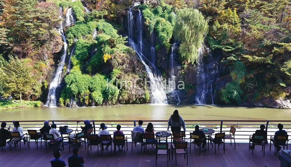Đối diện thác nước, bạn sẽ tìm thấy "Cafe Thác Nước" (카페 폭포) với khu vực terrace thoáng đãng và một Thư viện nhỏ (폭포책방 아름인도서관) ấm cúng. Hãy gọi một ly cà phê, chọn một cuốn sách và tận hưởng cảm giác healing tuyệt đối bên tiếng thác đổ.