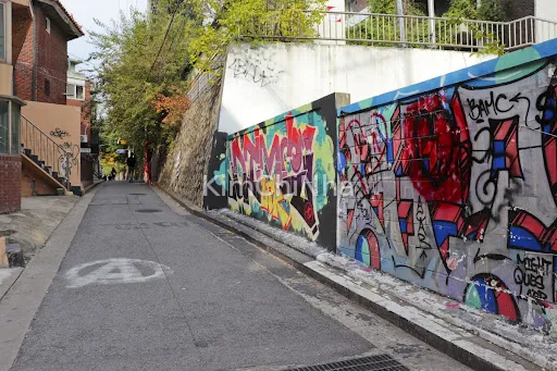 📸 Tip nhỏ: Hãy ghé “Hongdae Mural Street” (홍대벽화거리) - con phố nổi tiếng nhất với hàng chục bức graffiti khổng lồ, siêu hợp để chụp hình streetstyle.