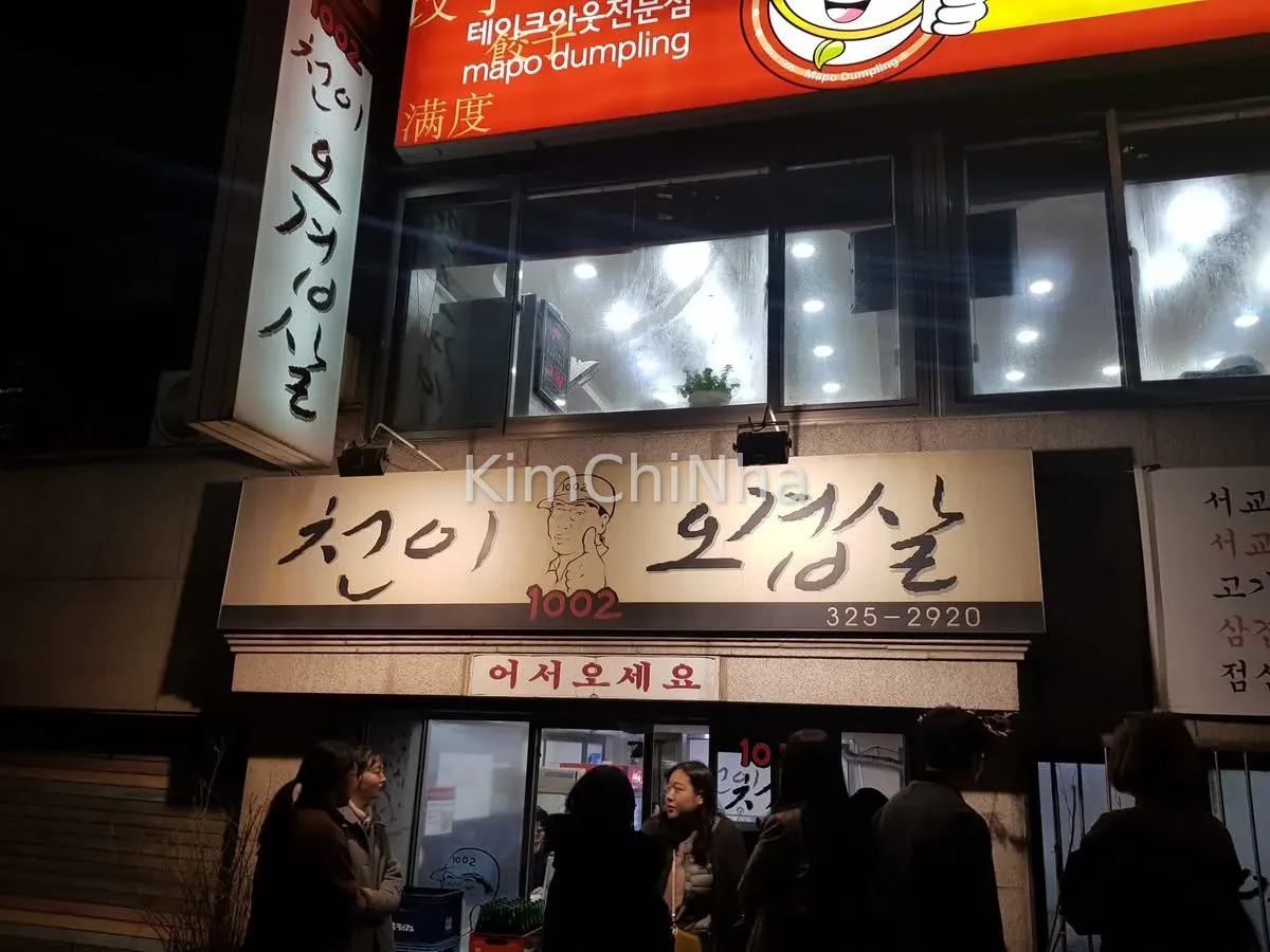 Nằm gần lối ra số 2 của ga Hapjeong, Cheon-i Ogyeopsal gây ấn tượng ngay từ cái nhìn đầu tiên. Quán nằm khuất dạng bán hầm, tựa như một căn bunker bí mật ẩn mình dưới mặt đường tấp nập. Bước qua cánh cửa, thực khách sẽ có cảm giác như đang bước vào một thế giới khác, tách biệt khỏi sự hối hả bên ngoài.