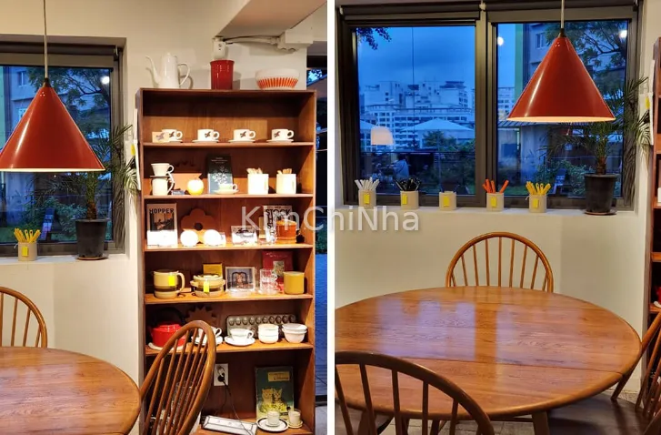 Bên ngoài là những bức tường trắng lặng im. Bên trong là ánh sáng tự nhiên, bàn ghế gỗ đơn sắc, sách và tạp chí nghệ thuật nằm yên trên kệ. Cửa sổ lớn nhìn ra hàng cây phía trước – mùa thu là lúc ánh nắng hanh hao phủ lên những tán lá chuyển màu. Chỉ cần ngồi đó thôi, gọi một ly cà phê, là đã thấy lòng dịu xuống.