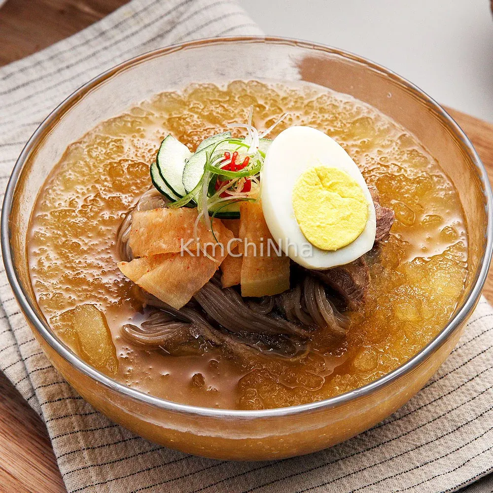 Đặc trưng bởi nước dùng lạnh trong vắt (hầm từ thịt bò, gà hoặc kimchi củ cải dongchimi). Bát mì thường kèm dưa leo, lê Hàn, trứng luộc và vài lát thịt bò. Người Hàn thường thêm giấm, mù tạt để tăng vị chua cay sảng khoái.