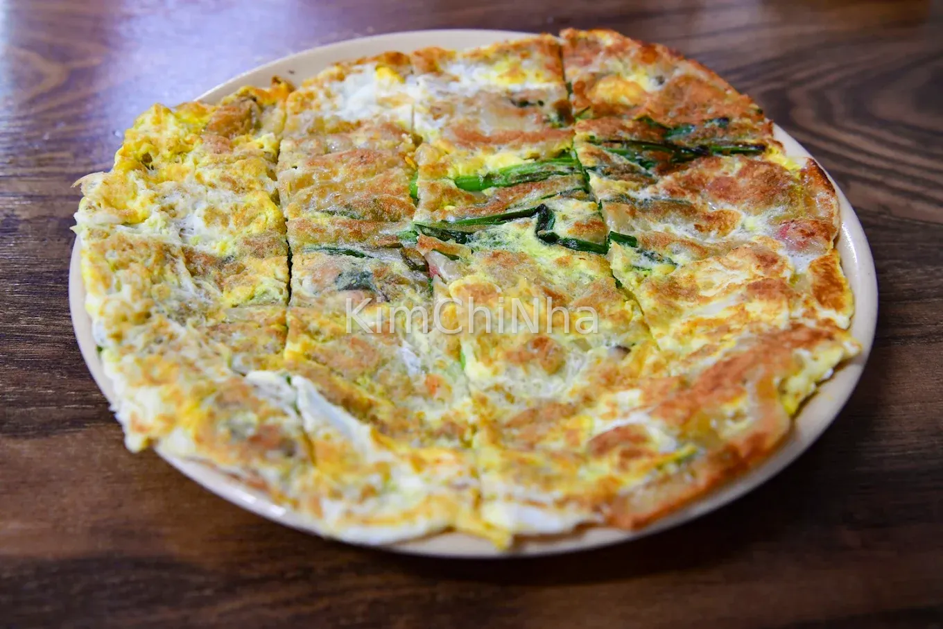 Một cảm giác thật thỏa mãn! Món khai vị: Bánh Khoai Tây (Gamja-jeon) Chiếc bánh được mang ra nóng hổi, khói bốc nghi ngút. Bánh khá dày, được chiên vàng ruộm.