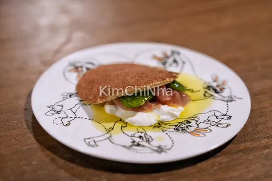 Blini kiểu Nga: pancake kiều mạch kẹp phô mai stracciatella, đào Earl Grey, thịt nguội jamón và lá húng quế – tựa bữa brunch châu Âu.