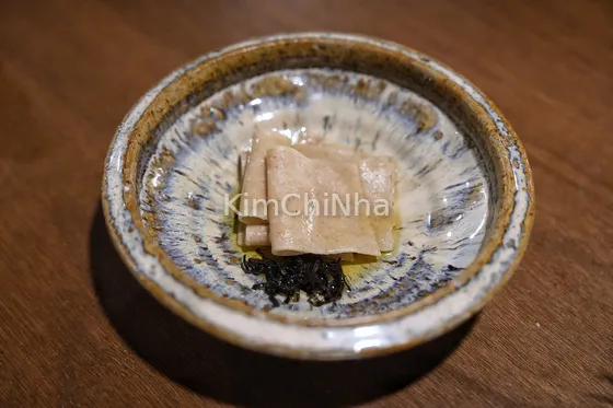 Đậu hũ kiều mạch: mềm mượt như nhím biển, ăn kèm sashimi, sốt vinaigrette dầu perilla – miso – giấm, rắc thêm kiều mạch rang giòn.