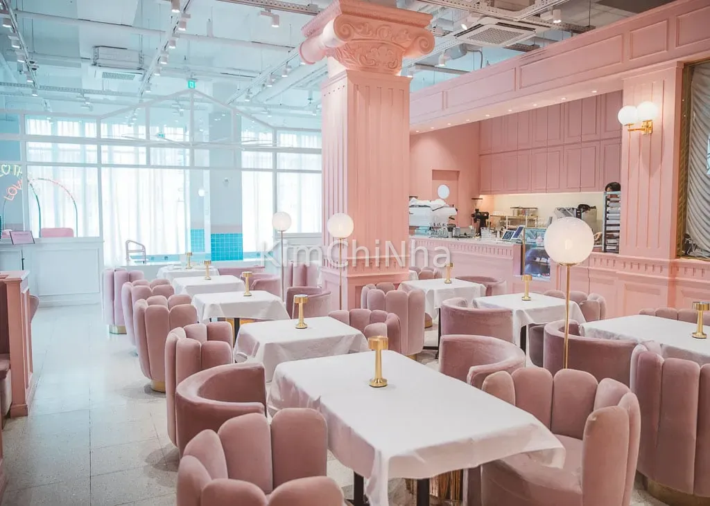 Tone màu chủ đạo của quán là hồng pastel pha be, kết hợp gương lớn và ánh sáng tự nhiên. Những góc như bậc thang, sofa cạnh hồ, cửa sổ tròn… đều là “spot sống ảo” huyền thoại.