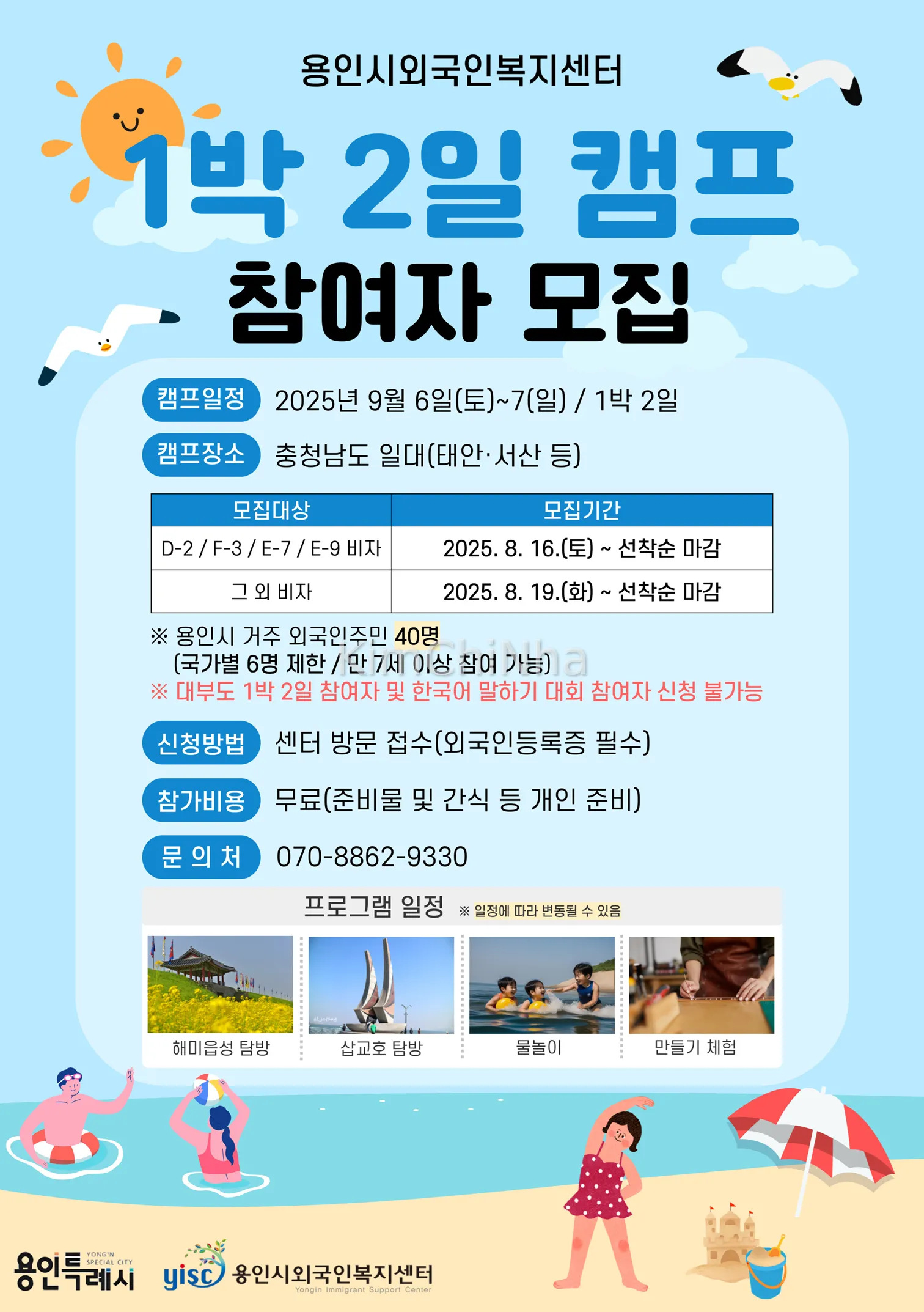 Bạn đang sinh sống tại Yongin và muốn có một chuyến đi nghỉ ngắn ngày thật vui vẻ, kết nối bạn bè bốn phương? Hãy tham gia chương trình 1박 2일 캠프 (1 đêm 2 ngày) do 용인시외국인복지센터 (Trung tâm Phúc lợi Người nước ngoài Yongin) tổ chức, hoàn toàn miễn phí dành riêng cho cộng đồng người nước ngoài.