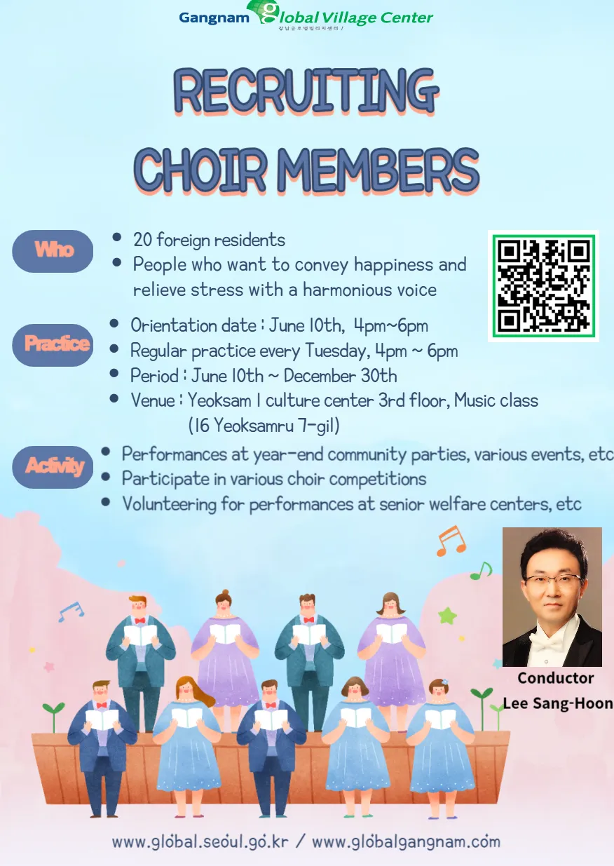 🎶 Bạn yêu thích ca hát? Muốn kết nối với bạn bè quốc tế và tỏa sáng trên sân khấu? Dàn hợp xướng Gangnam Global đang tuyển 20 cư dân nước ngoài tham gia lớp hát bán niên 2025 do nhạc trưởng chuyên nghiệp Lee Sang-Hoon hướng dẫn!