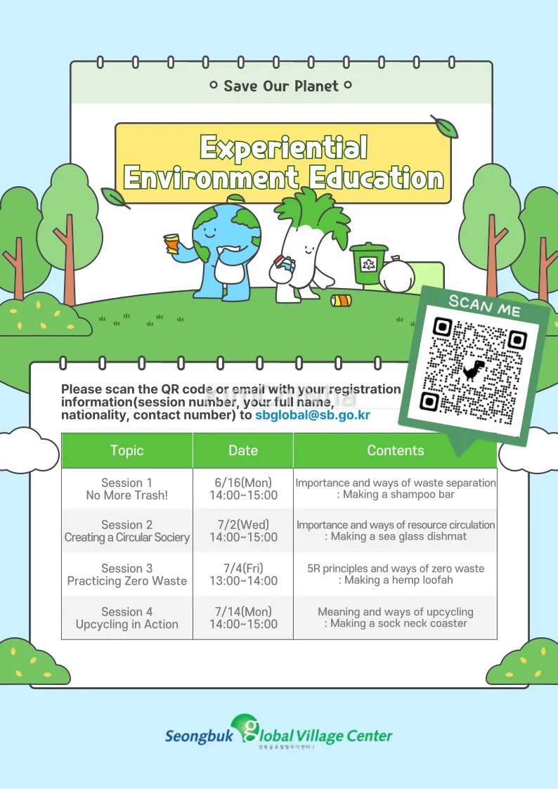 💡 Trung tâm Seongbuk Global Village tổ chức chuỗi 4 buổi học trải nghiệm môi trường miễn phí, bằng tiếng Anh, dành cho người nước ngoài – nội dung dễ hiểu, thú vị và ứng dụng ngay vào đời sống!