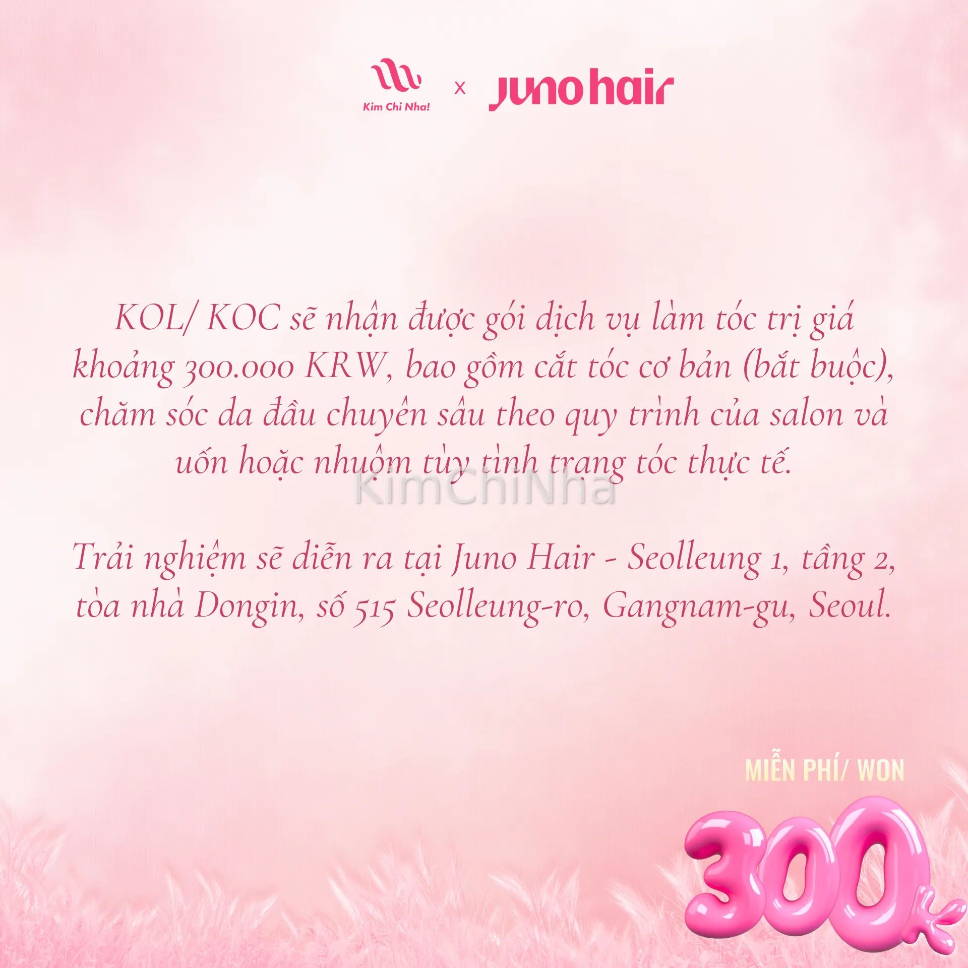 Kim Chi Nha hợp tác cùng Juno Hair Seolleung 1 (Gangnam), thuộc chuỗi salon tóc hàng đầu Hàn Quốc Juno Hair,  tuyển chọn những influencer cá tính đang sinh sống tại Hàn Quốc để trải nghiệm gói chăm sóc tóc chuyên nghiệp trị giá 300,000 KRW (miễn phí 100%). Không chỉ là một buổi làm tóc, đây còn là dịp để bạn xây dựng hình ảnh cá nhân, tạo nội dung viral và kết nối với cộng đồng làm đẹp tại Hàn Quốc.