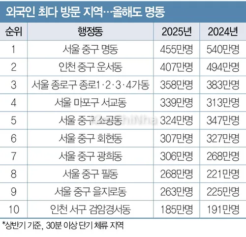 Trong nửa đầu năm 2025, Myeong-dong (Seoul) tiếp tục giữ vững vị thế là địa điểm được khách du lịch nước ngoài ghé thăm nhiều nhất với khoảng 4,55 triệu lượt khách – theo số liệu từ LG Uplus (dựa trên lượng sử dụng roaming).