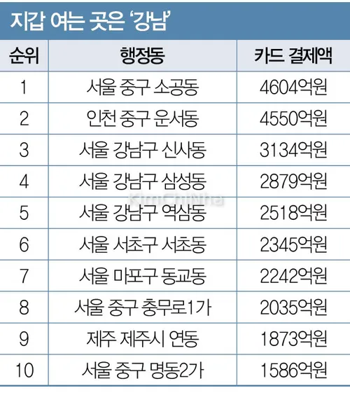 Dù Myeong-dong vẫn là “thánh địa du lịch”, nhưng về mặt chi tiêu, khu vực Gangnam lại nổi bật hơn. Theo dữ liệu từ Hana Card, đứng đầu về tổng chi tiêu là khu vực Sogong-dong (liền kề Myeong-dong), với tổng chi tiêu đạt 4.604 tỷ KRW, tăng mạnh so với năm trước.