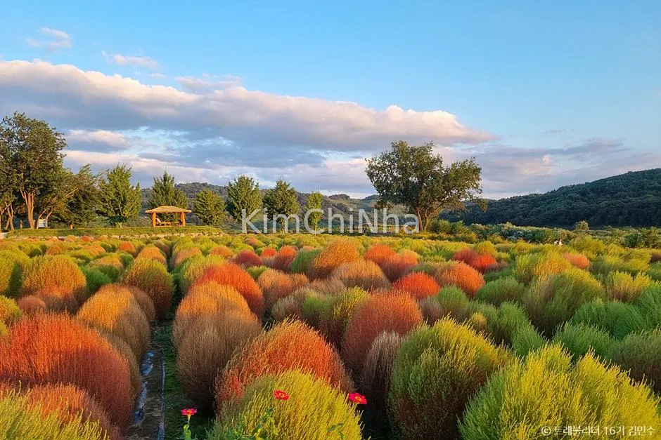 Tháng 9 này, Anseong Farmland được bao phủ bởi sắc vàng của hoa cúc. Bạn sẽ được đi dạo giữa những thảm hoa rộng lớn, cảm nhận từng cơn gió mát lành thổi qua. Đặc biệt, cảnh hoàng hôn ở đây đẹp đến nao lòng. Khi ánh mặt trời lặn, sắc vàng của hoa cúc hòa quyện với màu cam, đỏ của bầu trời, tạo nên một khung cảnh huyền ảo, lãng mạn đến khó tả.