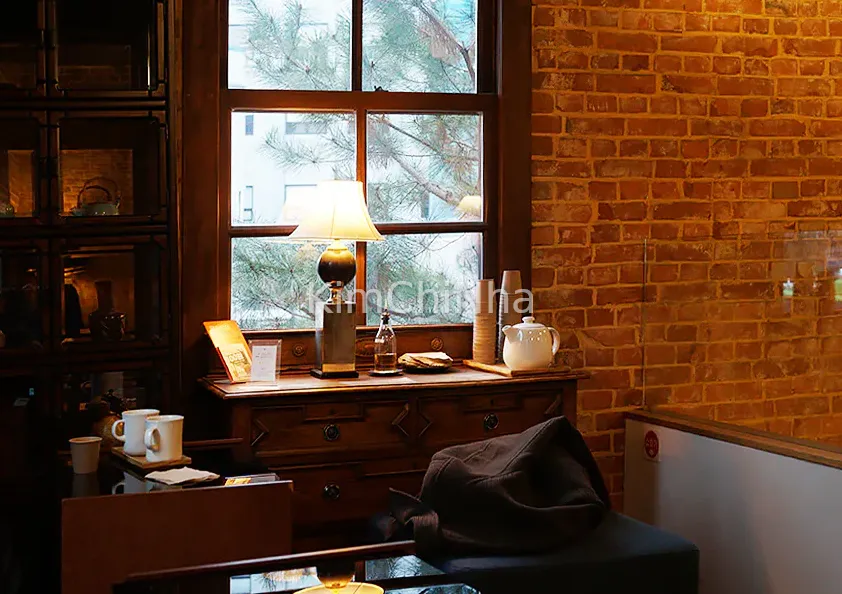 • Tường gạch đỏ, bàn gỗ sậm màu, cửa kính dài lấy sáng, không gian gợi cảm giác chậm và yên.