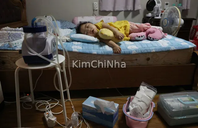 Tại một căn phòng nhỏ ở Jinju, tỉnh Gyeongsang Nam, bé Na Young (tên giả, 4 tuổi) đang nằm ngủ với một loạt các thiết bị y tế quanh người. Máy thở, máy tạo oxy và ống truyền dinh dưỡng nối thẳng vào cơ thể bé. Na Young mắc bệnh cơ tim, tổn thương não và bệnh phổi nghiêm trọng bẩm sinh. Em không thể tự thở, ăn uống hay cử động, phải phụ thuộc hoàn toàn vào những chiếc ống và sự chăm sóc 24/7 của mẹ.