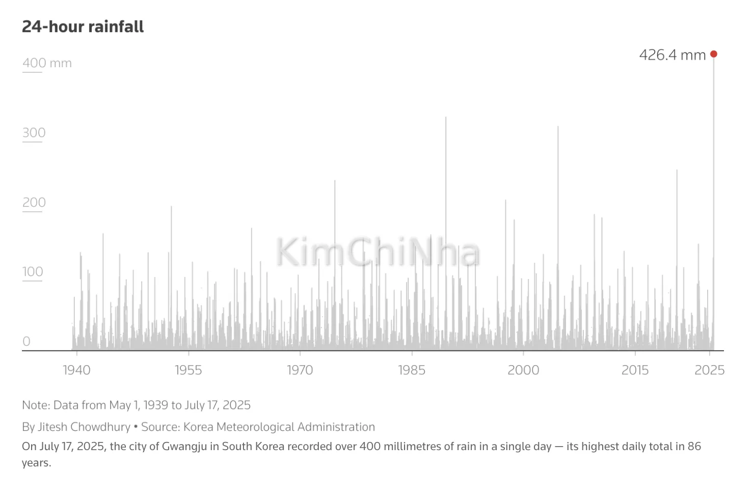 Theo Reuters, trong 24 giờ tính đến sáng 18/7/2025, thành phố Gwangju ghi nhận lượng mưa vượt ngưỡng 400mm – mức cao nhất trong vòng 86 năm qua. Cơn mưa kéo dài suốt ba ngày đã gây ngập lụt nghiêm trọng tại các tỉnh miền Nam và miền Tây Hàn Quốc.