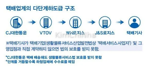 Ngành giao hàng tại Hàn Quốc không có khái niệm nhân viên chính thức. Các tập đoàn lớn như CJ Logistics chỉ ký hợp đồng với “đại lý” (thầu phụ cấp 1), từ đó phân bổ xuống nhiều lớp trung gian.