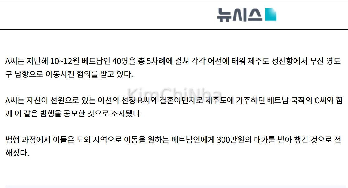 Kết quả điều tra cho thấy trong thời gian từ tháng 10 đến tháng 12 năm 2024, người này đã cùng một thuyền trưởng người Hàn Quốc và một người phụ nữ Việt Nam cư trú tại Jeju nhiều lần tổ chức đưa tổng cộng 40 người Việt từ cảng Seongsan (Jeju) đến khu vực Namhang, quận Yeongdo, Busan.