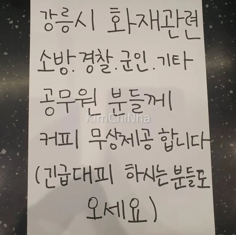Thông báo được dán trên cửa tiệm: 강릉시 화재관련 소방. 경찰. 군인. 기타 공무원 분들께 커피 무상제공 합니다 (긴급대피 하시는 분들도 오세요) Tạm dịch: Liên quan đến vụ hỏa hoạn tại thành phố Gangneung Xin được phục vụ cà phê miễn phí cho các cán bộ công vụ: lính cứu hỏa, cảnh sát, quân nhân, và các cán bộ khác (Những người đang sơ tán khẩn cấp cũng xin mời ghé qua)