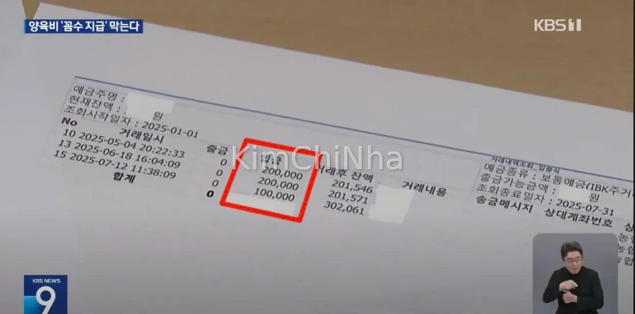 Theo quy định, cô phải được nhận 1,3 triệu won tiền nuôi con mỗi tháng. Tuy nhiên, trong ba tháng trước khi chính sách mới có hiệu lực, chồng cũ chỉ gửi tổng cộng 50.000 won chia làm ba lần. Điều này giúp anh ta né tránh việc bị Nhà nước thu hồi tiền trợ cấp, vì chỉ cần có khoản cấp dưỡng – dù rất nhỏ – trong ba tháng liên tiếp, vẫn không bị xếp vào diện vi phạm.