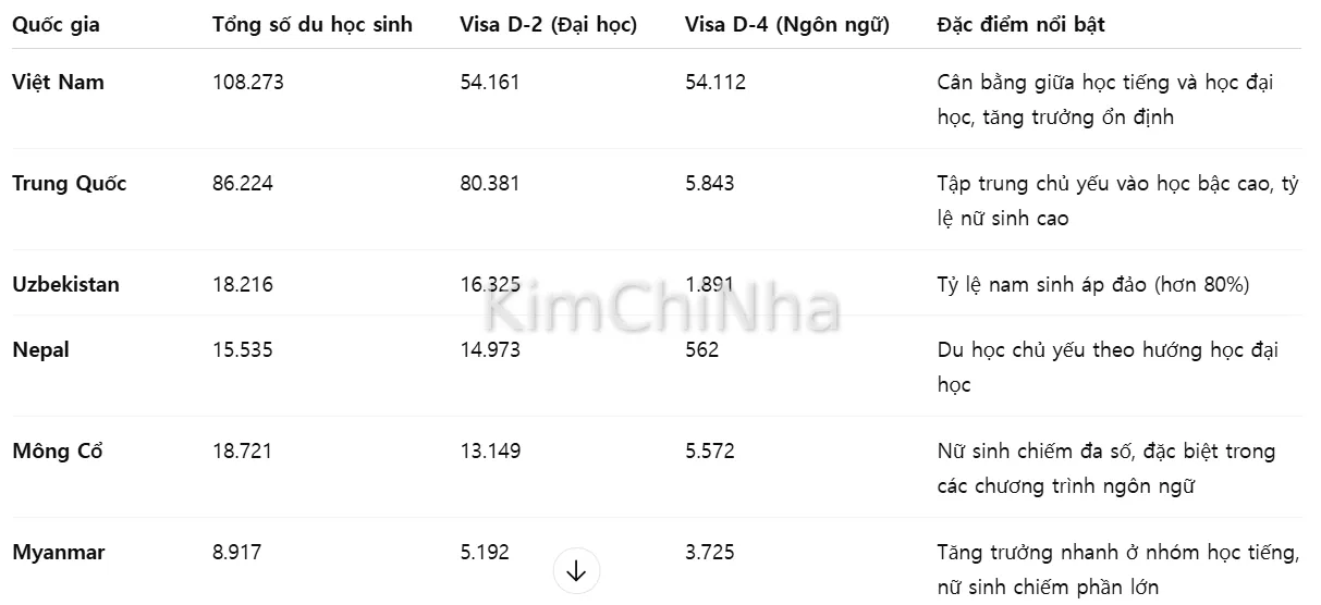 Đáng chú ý, Việt Nam là quốc gia duy nhất có tỷ lệ cân bằng giữa hai loại hình học tập: vừa có số lượng lớn theo học đại học – sau đại học (D-2), vừa có đông đảo học viên học tiếng (D-4). Điều này phản ánh chiến lược du học toàn diện, không chỉ đi học ngắn hạn mà còn hướng đến định hướng nghề nghiệp dài hạn tại Hàn Quốc.