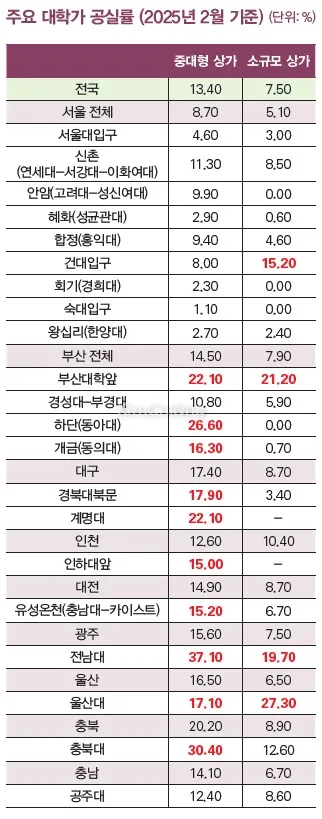Theo dữ liệu hệ thống thống kê bất động sản (2/2025), tỷ lệ trống của mặt bằng kinh doanh quanh các trường địa phương cao gấp nhiều lần thủ đô: Đại học Chonnam 37,1%, Đại học Chungbuk 30,4%, Đại học Busan 22,1%, Đại học Dong-A 26,6%. Trong khi đó, hầu hết khu đại học Seoul giữ mức dưới 10%.