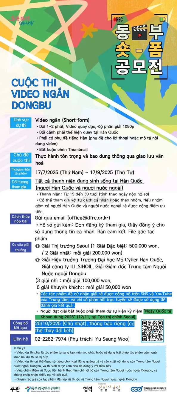 Bạn yêu thích làm video ngắn và muốn lan tỏa thông điệp tích cực về sự tôn trọng, bao dung trong đời sống đa văn hóa tại Hàn Quốc? Hãy tham gia Cuộc thi Video Ngắn Dongbu 2025 để vừa thử sức sáng tạo vừa có cơ hội nhận giải thưởng hấp dẫn.