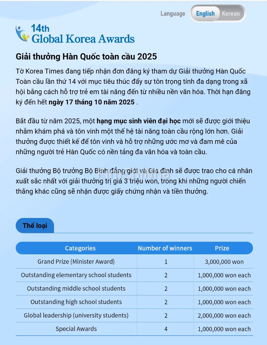 Bạn đang tìm kiếm một sân chơi để thể hiện tài năng và câu chuyện của mình? The Korea Times đang mở cổng nhận hồ sơ cho Giải thưởng "Global Korea" lần thứ 14, một giải thưởng danh giá nhằm tôn vinh và khuyến khích ước mơ của thanh thiếu niên và người trẻ có nền tảng đa văn hóa, toàn cầu đang sinh sống tại Hàn Quốc.Năm nay, giải thưởng mở rộng thêm hạng mục dành cho sinh viên đại học, tạo thêm cơ hội cho một thế hệ tài năng mới.