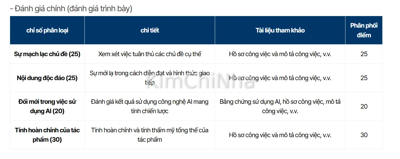 Vòng Chung kết: Đánh giá dựa trên sự phù hợp với chủ đề (25 điểm), tính độc đáo (25 điểm), tính đổi mới của AI (20 điểm) và độ hoàn thiện tổng thể của tác phẩm (30 điểm).