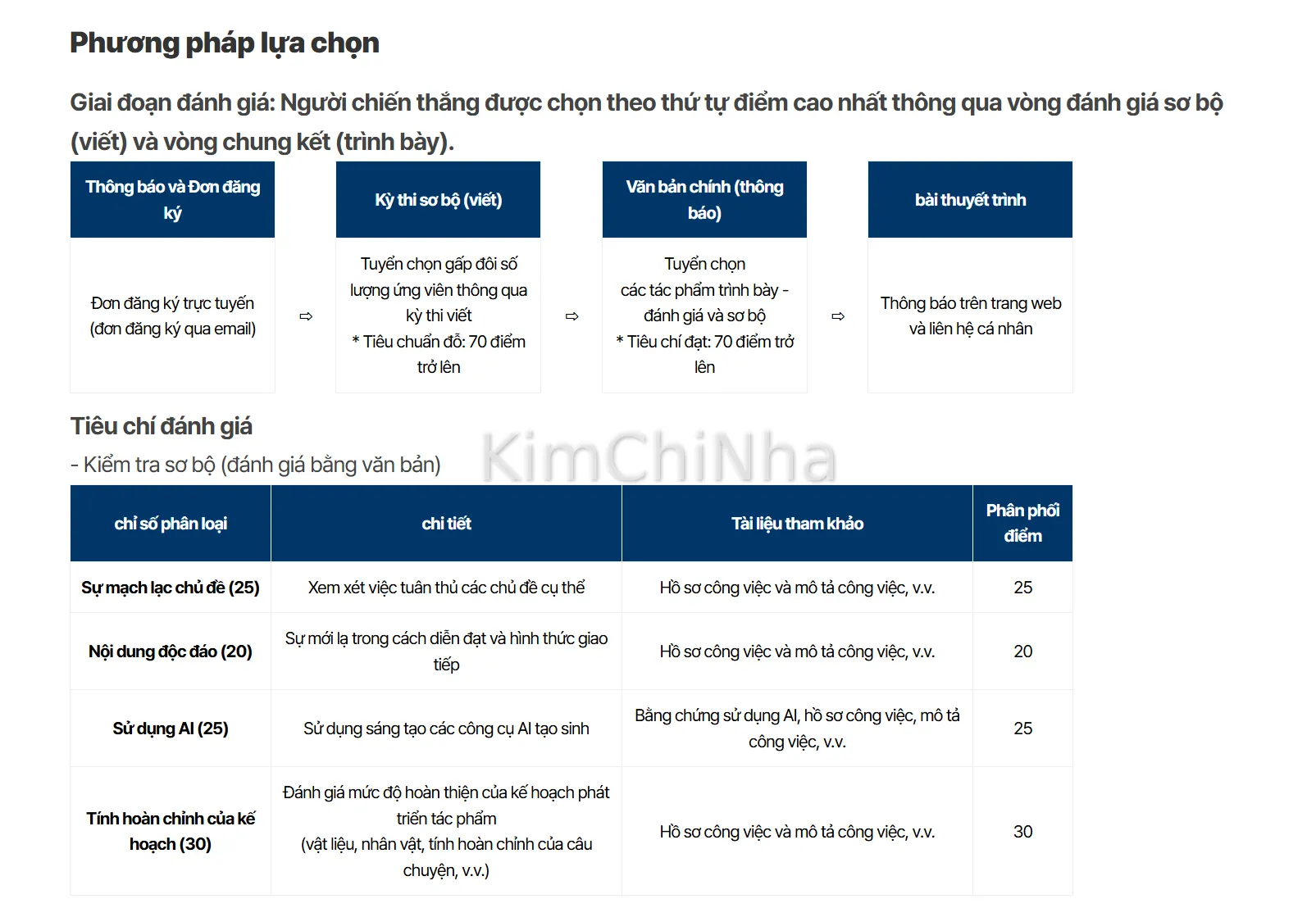 Vòng Sơ loại: Đánh giá dựa trên sự phù hợp với chủ đề (25 điểm), tính độc đáo (20 điểm), mức độ ứng dụng AI (25 điểm) và chất lượng kịch bản (30 điểm).