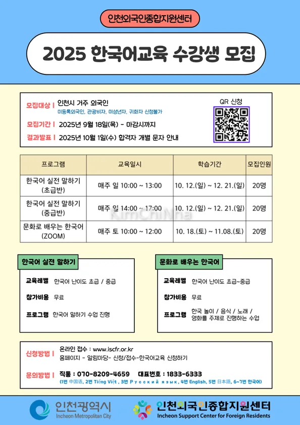 Bạn là người nước ngoài đang sinh sống tại Incheon và muốn cải thiện khả năng tiếng Hàn của mình? Trung tâm Hỗ trợ Tổng hợp cho Người nước ngoài Incheon (Incheon Support Center for Foreign Residents) vừa chính thức mở đơn đăng ký cho chương trình học tiếng Hàn học kỳ năm 2025. Đây là cơ hội hoàn toàn miễn phí giúp bạn nâng cao kỹ năng giao tiếp, trải nghiệm văn hóa và kết nối cộng đồng.