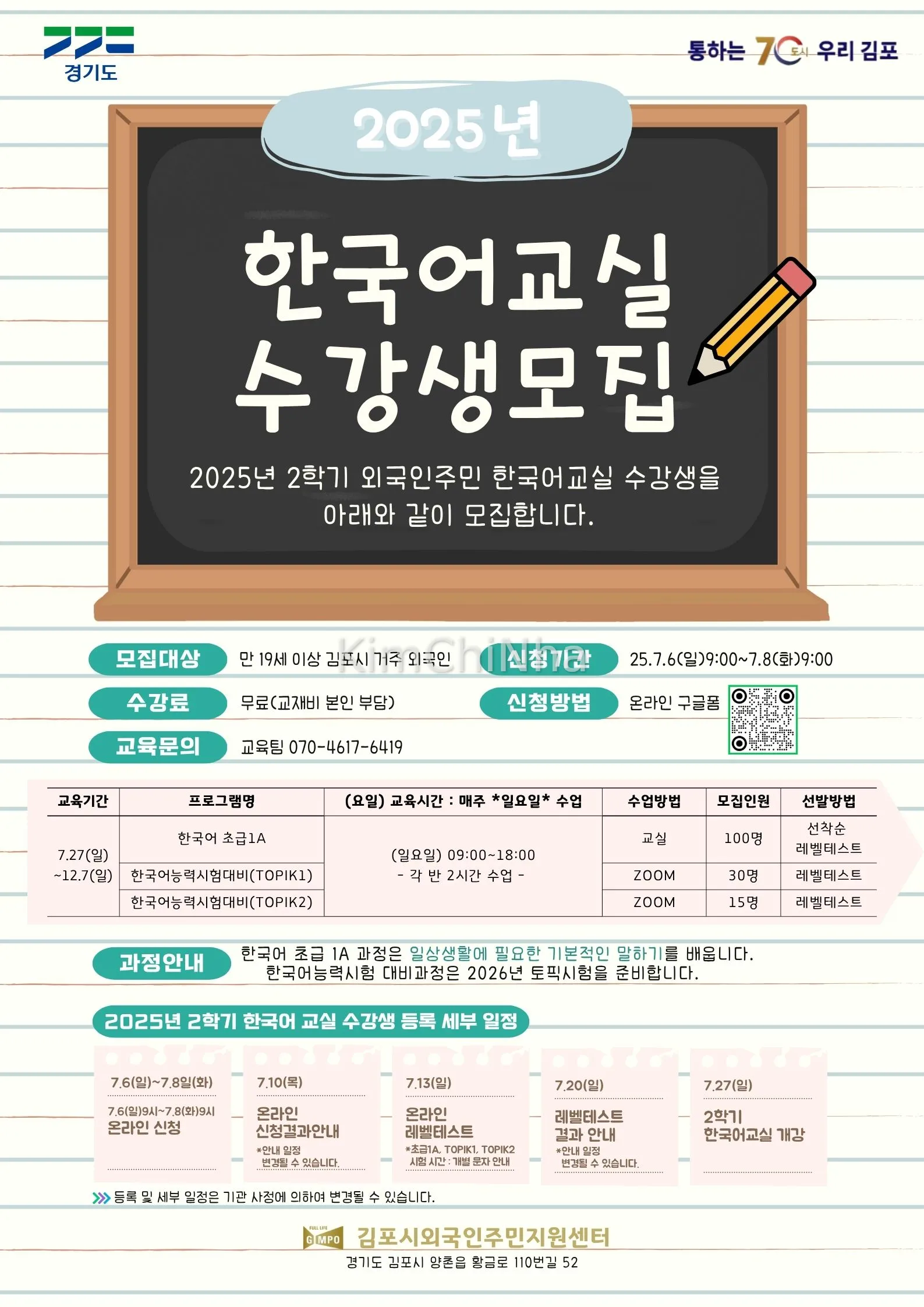 🏫 Địa điểm học offline: Trung tâm người nước ngoài Gimpo (Gyeonggi-do, Gimpo-si, Yangchon-eup, Hwanggeum-ro 110beon-gil 52)