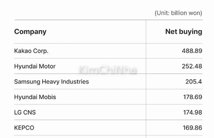 Trong danh mục bị bán ròng, Samsung Electronics ghi nhận mức cao nhất với 1.067,91 tỷ won (khoảng 20,3 nghìn tỷ VND), cho thấy tâm lý thận trọng đối với cổ phiếu công nghệ vốn được coi là trụ cột của thị trường. Naver, công ty internet hàng đầu, cũng bị bán ròng 735,94 tỷ won (khoảng 14 nghìn tỷ VND). Ngoài ra, các công ty công nghiệp như Hanwha Ocean (307,24 tỷ won) và Doosan Enerbility (204,92 tỷ won) cũng nằm trong nhóm chịu áp lực bán mạnh.