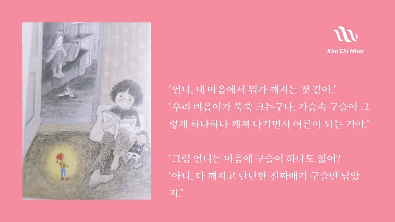 Trong hành trình ấy, bên cạnh Bieup còn có chị Geureoge chủ hiệu sách cũ, người lắng nghe và thấu hiểu cô bé bằng cả tấm lòng. Những lời khuyên từ chị Geureoge không chỉ giúp Bieup học cách tự bảo vệ trái tim mình mà còn nhắc nhở người lớn về vai trò của mình trong thế giới nội tâm của trẻ nhỏ: biết lắng nghe, biết chở che nhưng không áp đặt, luôn để lại cho trẻ sự an toàn để lớn lên theo cách của riêng mình.