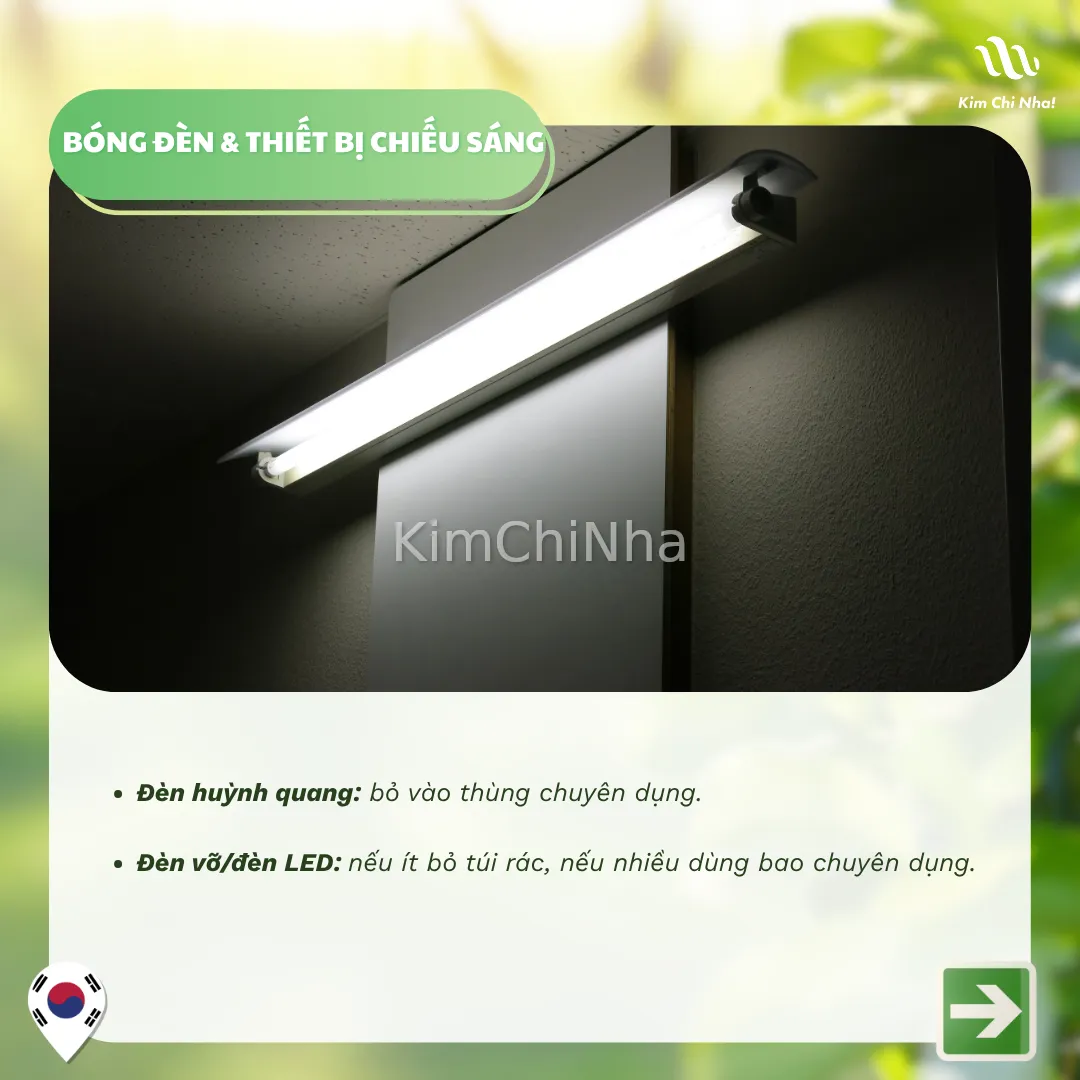 Đèn vỡ/đèn LED: nếu ít bỏ túi rác, nếu nhiều dùng bao chuyên dụng.