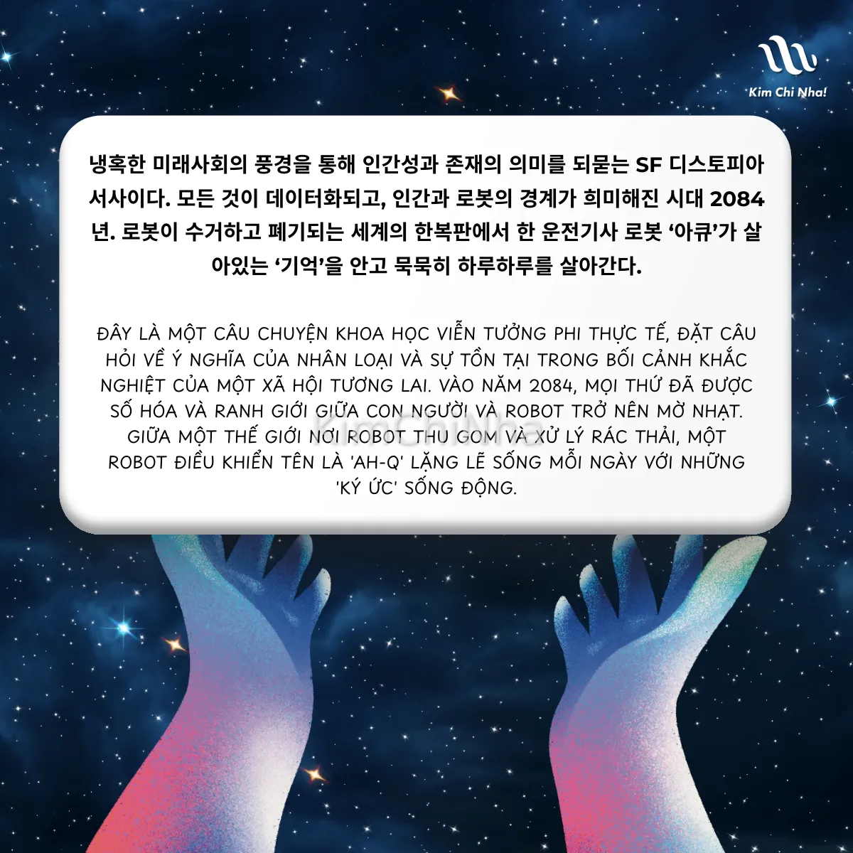 Gặp Bullet một cô bé robot bị tuyên án "phế liệu", A큐 lựa chọn bảo vệ thay vì vâng lời. Không khí truyện không dữ dội, nhưng lặng lẽ, day dứt như thể từng câu chữ đều viết bằng chất thải của một thế giới đã vứt đi nhân tính. 2084 không mang màu sắc sấm truyền như 1984 của Orwell, cũng không mượn khoa học để bày trò như nhiều tiểu thuyết cyberpunk.