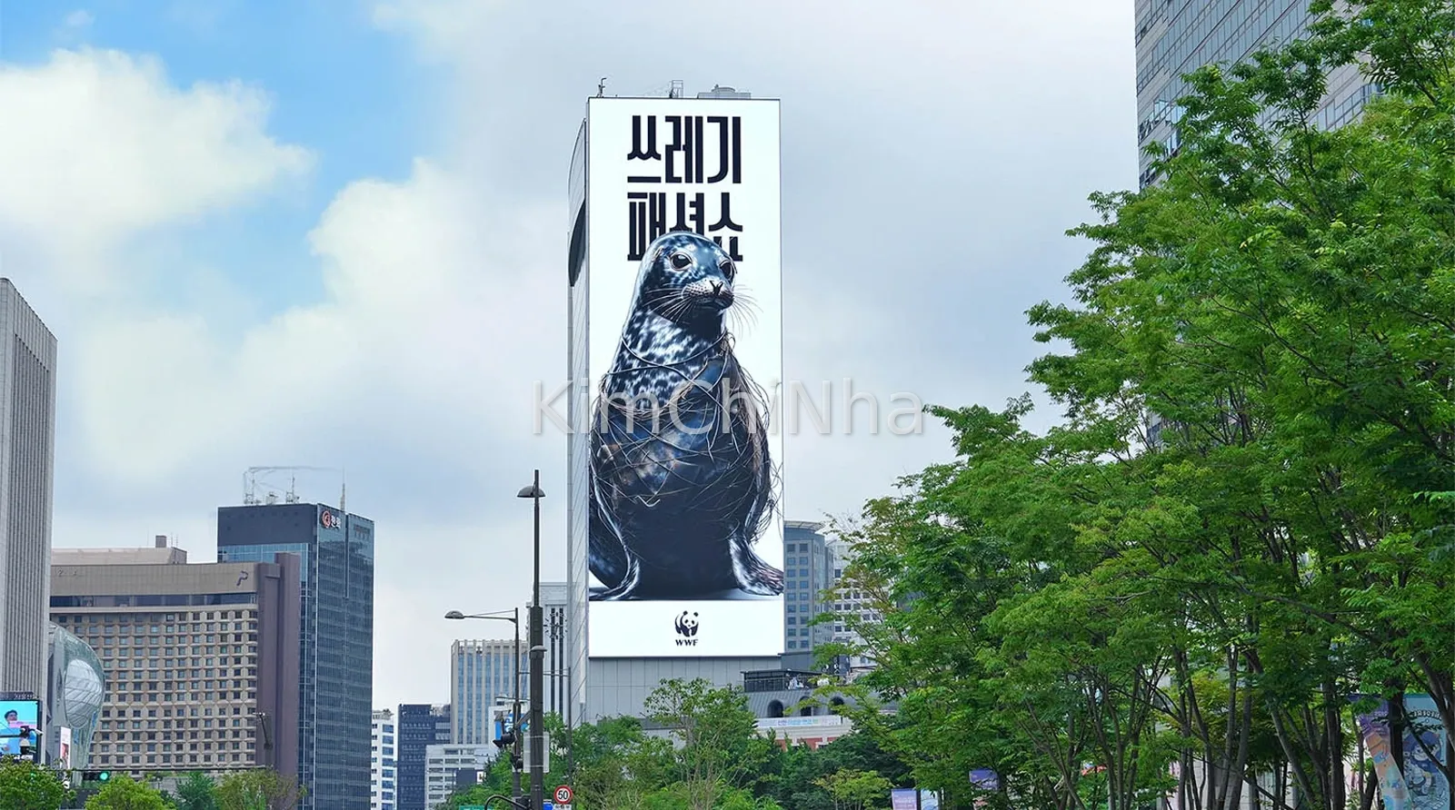 Tất cả hình ảnh được dựng bằng Generative AI, tạo nên những visual chân thực như ảnh chụp nhưng không làm tổn hại đến bất kỳ sinh vật nào. Chiến dịch chọn bảng LED ngoài trời khổng lồ (20m × 60m) tại Gwanghwamun trung tâm Seoul nơi người qua đường không thể không dừng lại. Kết quả? Một cú tát thẩm mỹ. Mỗi khung hình vừa đẹp vừa nghẹn vừa đau đến xót xa.