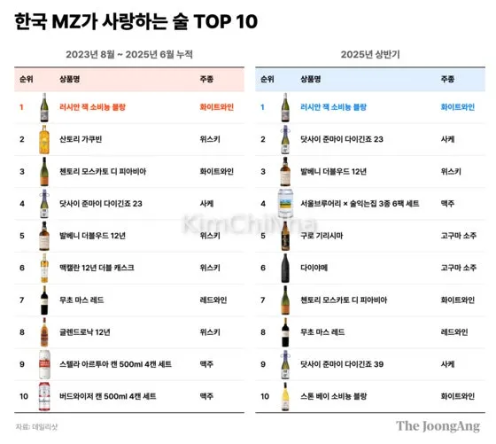 Trong 2 năm qua, rượu vang trắng “Russian Jack Sauvignon Blanc” – giá khoảng 20.000 won – là sản phẩm bán chạy nhất. Rượu này được đánh giá phù hợp cho người mới bắt đầu nhờ hương vị dễ chịu và dễ kết hợp với nhiều món ăn. Nhưng điều tạo nên sức hút lớn lại là yếu tố người nổi tiếng. Chuyên viên quản lý sản phẩm rượu vang của DailyShot, Kim Sun-ah, cho biết: “Loại rượu này nổi tiếng vì được BTS V mua dự trữ, và tháng 8 năm ngoái còn ra mắt phiên bản giới hạn với nhãn do diễn viên Ha Jung-woo tự tay thiết kế.” Hiệu ứng người nổi tiếng giúp xóa bỏ rào cản, thu hút người tiêu dùng mới. Ngoài ra, rượu sake “Dassai Junmai Daiginjo 23” cũng được ưa chuộng, nhất là mùa lễ tết, còn “Daiginjo 39” góp mặt trong top đầu đầu năm nay, cho thấy thị trường sake cao cấp ngày càng phát triển. Whisky “Balvenie DoubleWood 12 năm” – nổi lên trong đại dịch – thu hút nhóm người mới và trung cấp.