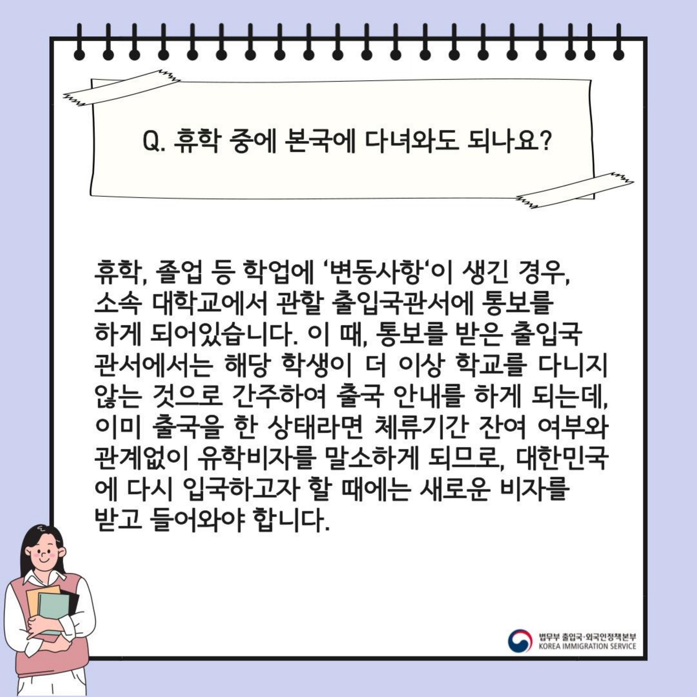 Nếu bạn bảo lưu hoặc tốt nghiệp, trường sẽ báo cáo thông tin lên Cục Xuất Nhập Cảnh và bạn có thể bị coi là không còn theo học tại trường. Khi đó, visa du học của bạn sẽ bị hủy bỏ bất kể còn thời gian lưu trú hay không. Nếu muốn quay lại Hàn Quốc, bạn phải xin visa mới.