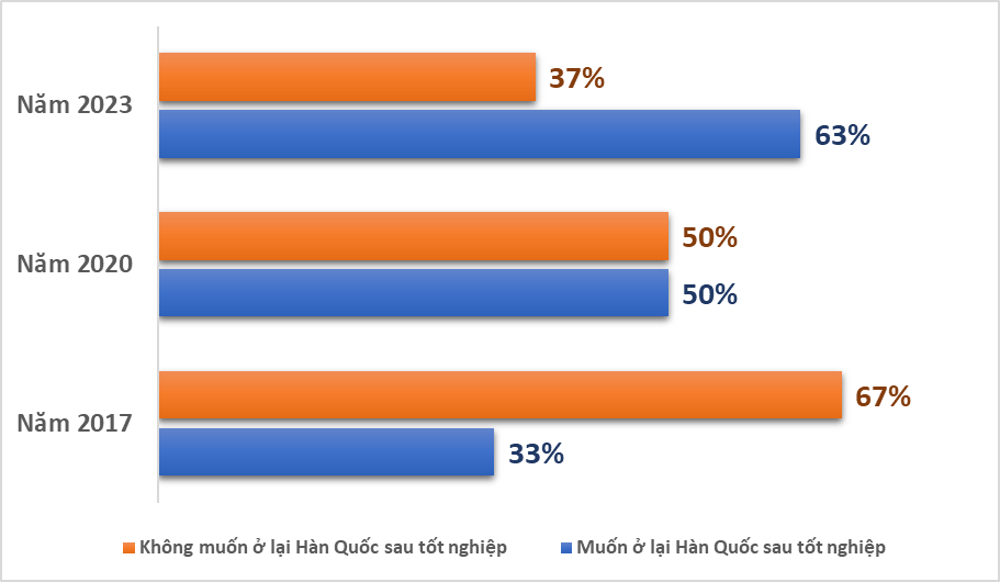 Theo phân tích của Viện Nghiên cứu Lao động Hàn Quốc, năm 2023, có 63% sinh viên quốc tế muốn ở lại Hàn Quốc sau khi tốt nghiệp. Trong đó, 69% sinh viên ngành Hàn Quốc học và 65% sinh viên ngành IT và kỹ thuật muốn định cư tại đây. Tỷ lệ này đã tăng đáng kể so với 33% năm 2017 và 50% năm 2020.