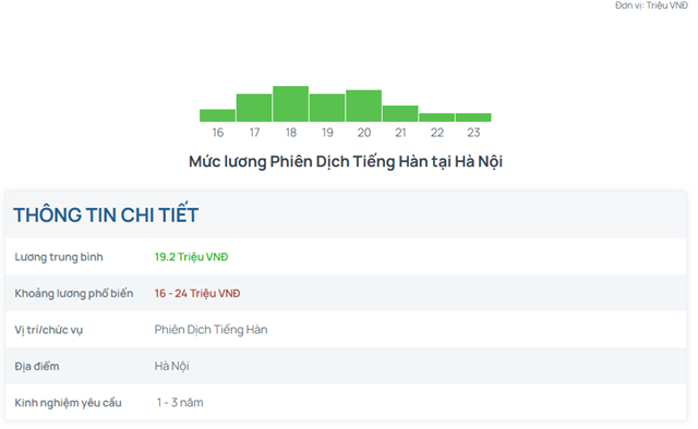 Theo cô Hường – Trưởng Khoa Ngôn ngữ và văn hóa Hàn Quốc (Đại học Ngoại ngữ, Đại học Quốc gia Hà Nội), mức lương khởi điểm của sinh viên tốt nghiệp chuyên ngành tiếng Hàn rơi vào khoảng 9-15 triệu đồng/tháng và có thể tăng lên 20 triệu đồng sau 2-3 năm. Ngoài ra, các bạn freelancer có kỹ năng tốt có thể có thu nhập 3.000-5.000 USD/ tháng. Trong khi đó, mức lương trung bình hàng tháng của người Việt Nam hiện ở mức khoảng 6,7 triệu đồng. Ngoài ra, một cuộc khảo sát năm 2019 của Đại học Ngoại ngữ - Đại học Quốc gia Hà Nội cho thấy tỷ lệ sinh viên tốt nghiệp ngành ngôn ngữ Hàn Quốc có việc làm sau khi tốt nghiệp đạt mức 98%.