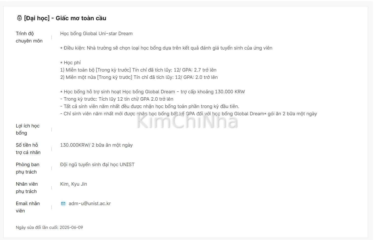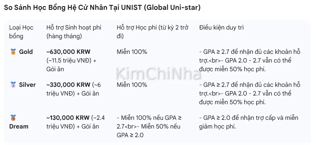 Quyền lợi: Miễn toàn phần hoặc một nửa học phí tùy thuộc vào GPA. Hỗ trợ sinh hoạt phí từ 130,000 KRW đến 630,000 KRW/tháng, kèm theo gói ăn 2 bữa/ngày.