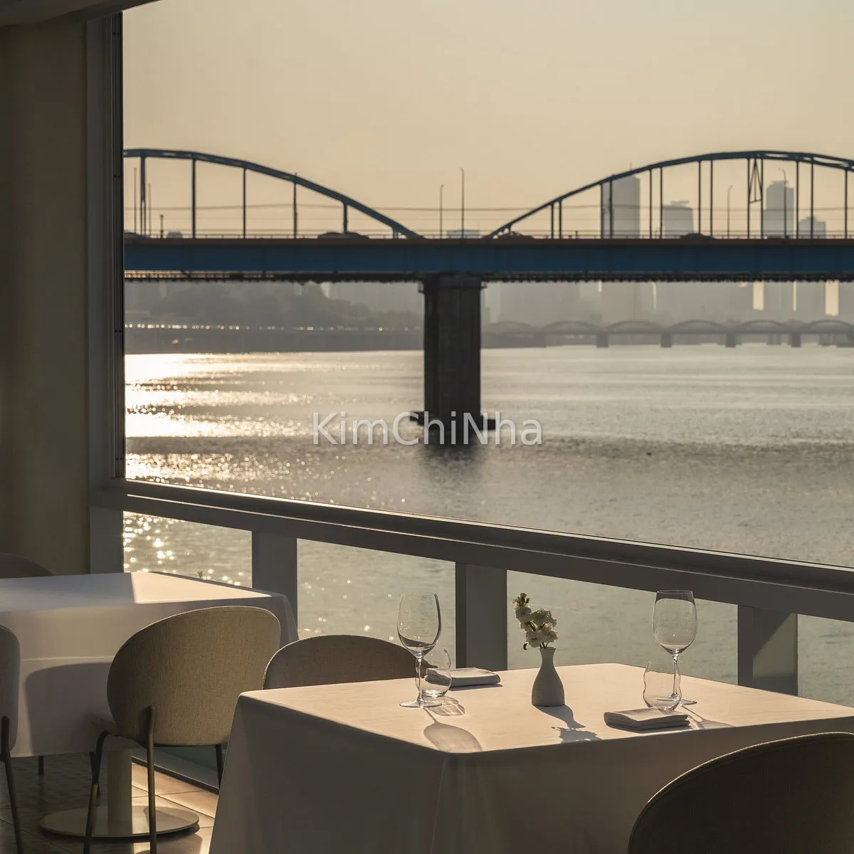 Nếu bạn muốn một trải nghiệm độc đáo hơn, hãy đến Le Da - một nhà hàng nằm trong tổ hợp nổi trên sông Hàn. Vị trí tuyệt đẹp này cho phép bạn vừa ăn vừa ngắm nhìn cây cầu Banpo nổi tiếng với màn trình diễn nhạc nước, và xa xa là tháp Namsan.